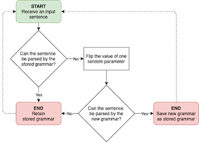 The TLA is an algorithm developed by Gibson & Wexler (1994) to characterize the acquisition of syntax by first-language learners. It assumes that the learning task involves setting a finite number of binary parameters: at any given time, the learner's grammar can be represented as just a vector of ones and zeroes. The flowchart below illustrates how it works, informally.